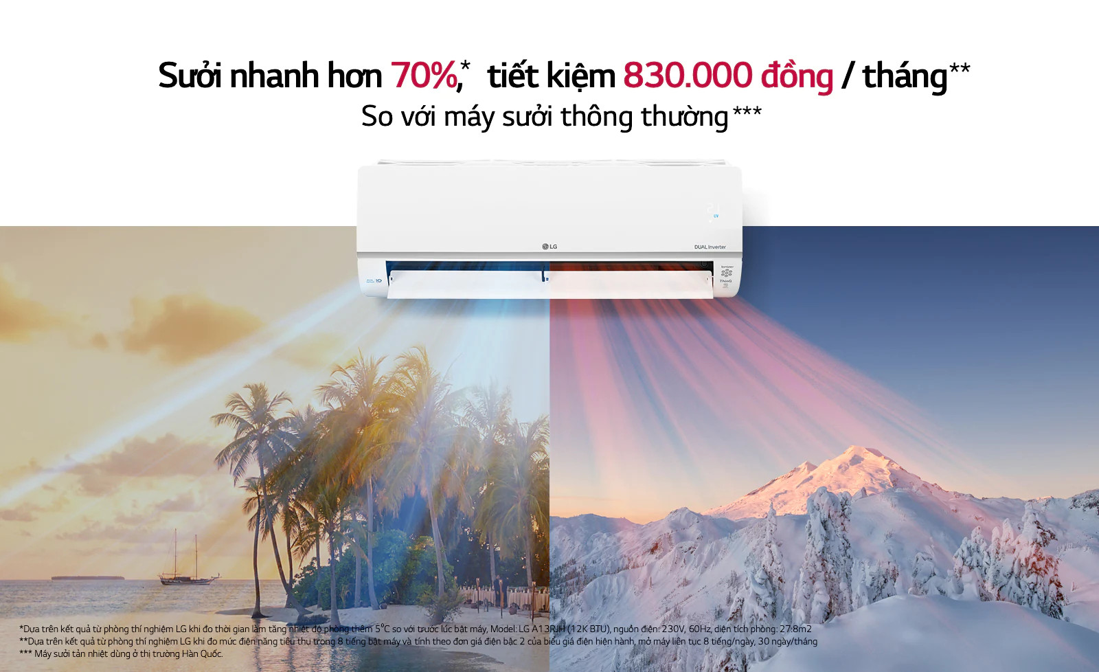 Sử dụng công nghệ Dual Inverter CompressorTM của LG giải quyết các vấn đề không thích hợp, không hiệu quả và tiếng ồn, cho phép có được máy điều hòa không khí làm mát nhanh hơn, bền hơn và hoạt động yên tĩnh hơn. Với thời hạn bảo hành 10 năm đối với máy nén, người dùng có thể tận hưởng quyền lợi của máy điều hòa không khí LG trong khoảng thời gian lâu hơn..