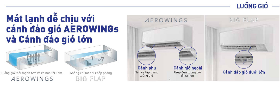 Công nghệ AEROWINGS mới được cải tiến mang lại luồng gió thổi xa tới 15 mét bằng cách kết hợp hai cánh đảo gió được điều khiển độc lập. Quạt gió có tiết diện lớn hơn (105mm) và cánh đảo gió ngoài lớn hơn (103mm) làm mát căn phòng trong thời gian ngắn nhất có thể, tăng lưu lượng gió lên 10%* và tốc độ gió lên 20%*. Do đó, bạn có thể cảm thấy thoải mái ngay cả khi bạn đi qua căn phòng